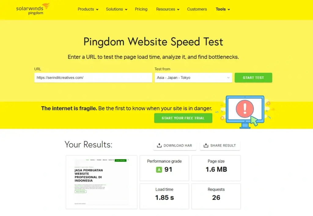 Pingdom Tools lebih fokus pada user experience. Tool ini akan menunjukkan seberapa cepat website diakses dari berbagai lokasi di dunia. Hasilnya bisa membantu kamu mengetahui apakah situs sudah optimal secara global.
